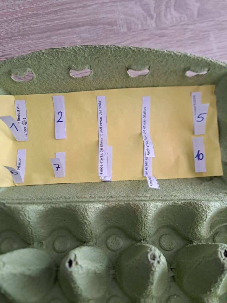 Dort bekamen die Kinder Eierkartons mit Aufgaben wie z.B. „Finde etwas, das schwimmt und etwas das sinkt“ oder „Finde etwas, in das man einen Knoten machen kann“, die sie erfüllen mussten.
